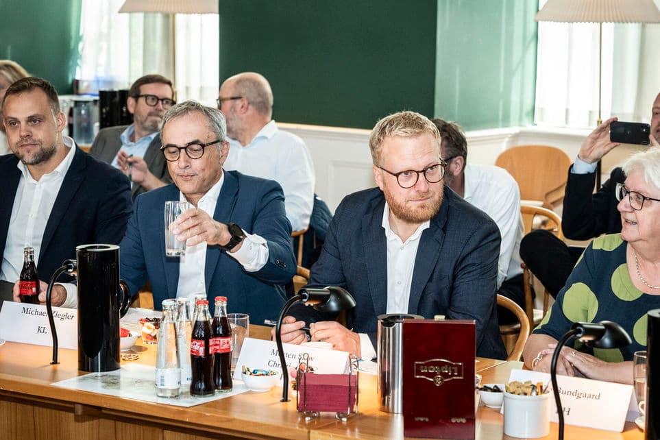 Kommunal topforhandler Michael Ziegler, FH-formand Morten Skov Christiansen og CFU-formand Rita Bundgaard i forhandlingslokalet. | Foto: Emil Nicolai Helms/Ritzau Scanpix