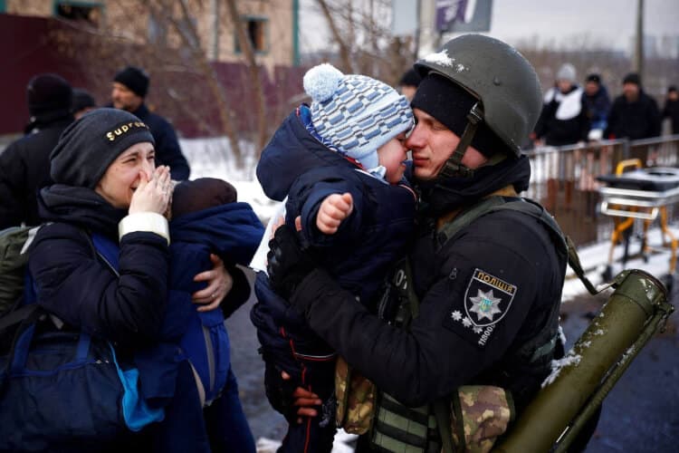En ukrainsk politibetjent siger farvel til sin familie, inden den flygter fra de russiske angreb. Ukrainsk fagbevægelse tilbyder husly, mad og andre fornødenheder til flygtninge som dem. | Foto: Thomas Peter/Reuters/Ritzau Scanpix