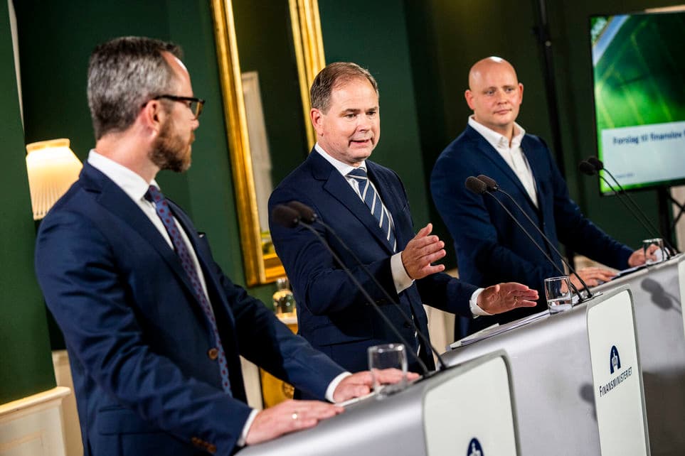 Flankeret af økonomiministeren og kulturministeren præsenterede finansminister Nicolai Wammen (S) torsdag SVM-regeringens forslag til finansloven for 2024. | Foto: Ida Marie Odgaard/Ritzau Scanpix
