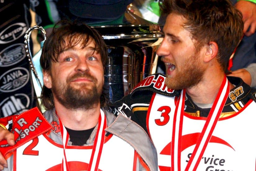 Mads Korneliussen er tidligere speedwaykører. Her står han (tv.) efter og hans hold i 2018 vandt Danmarks Mesterskaberne for hold. | Foto: Sportxpress/Ritzau Scanpix