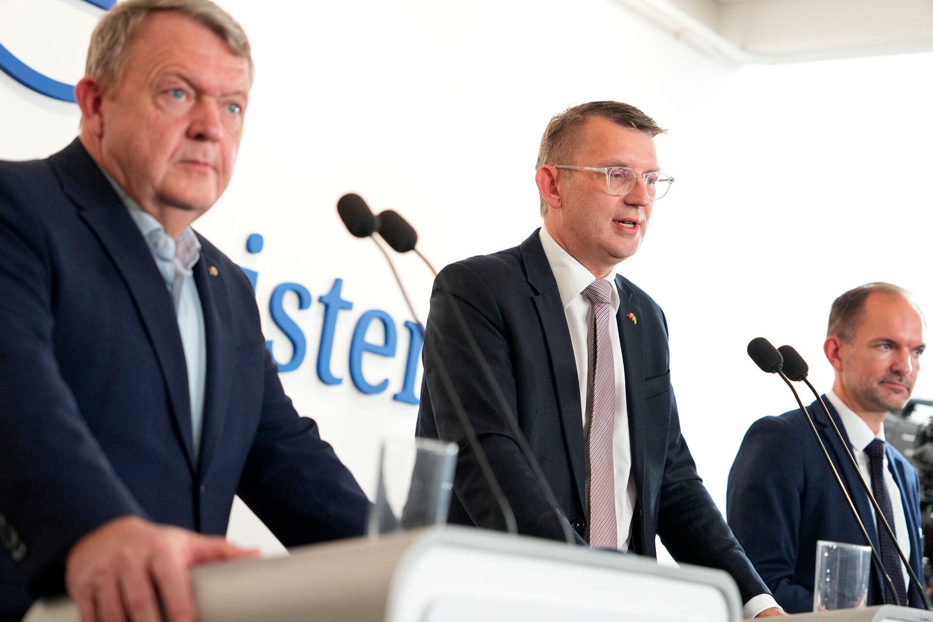 Udenrigsminister Lars Løkke Rasmussen (M), økonomi- og forsvarsminister Troels Lund Poulsen (V) og skatteminister Jeppe Bruus (S) præsenterer regeringens skatteudspil. | Foto: Mads Claus Rasmussen/Ritzau Scanpix