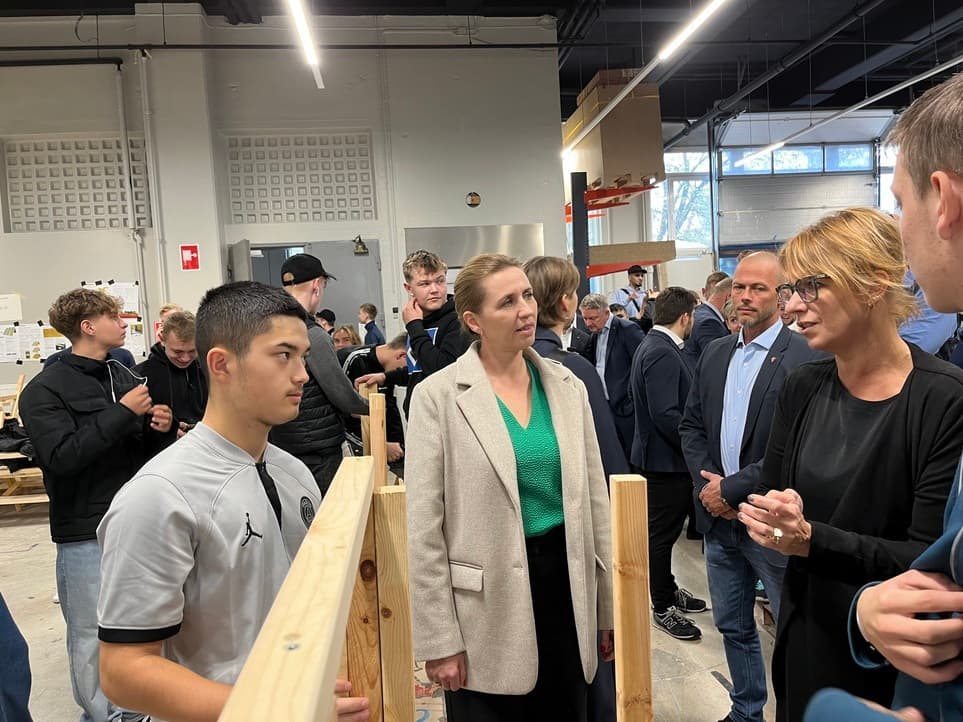 Statsministeren så under en rundvisning på Next mandag blandt andet tømrerelevernes værksteder. Socialdemokratiet står i den seneste meningsmåling fra Epinion til 24,4 procent af stemmerne. | Foto: Lasse Danielsen