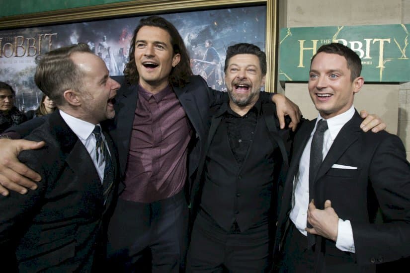 Elijah Wood (th) ses her sammen med "Ringenes Herre"-kollegerne (fra venstre) Billy Boyd, Orlando Bloom og Andy Serkis. | Foto: Mario Anzuoni/Reuters/Ritzau Scanpix (arkiv)