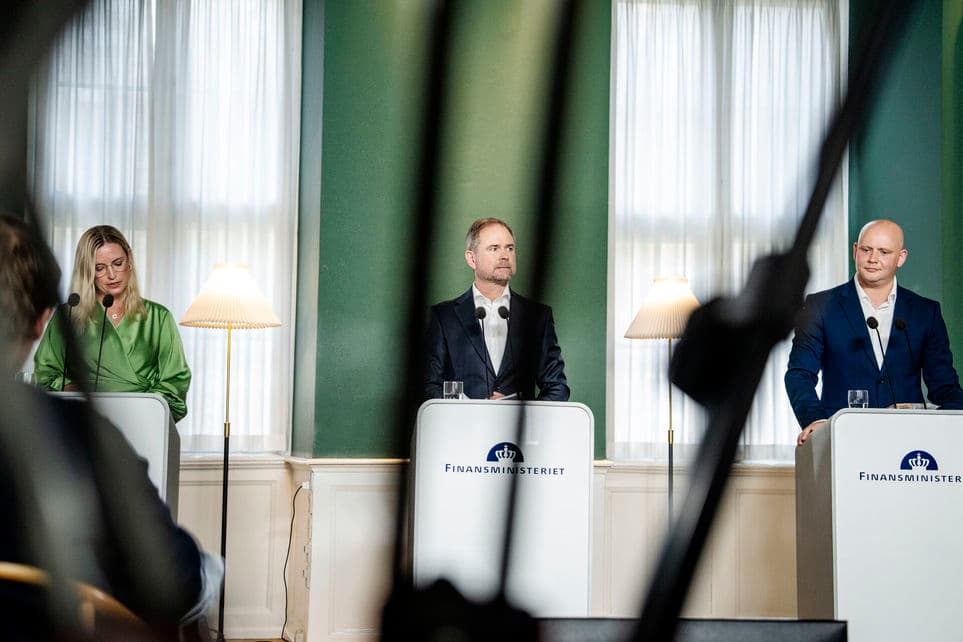 Finansminister Nicolai Wammen (S), økonomiminister Stephanie Lose (V) og kulturminister Jakob Engel-Schmidt (M) præsenterer finanslovforslaget for 2026 på et pressemøde i Finansministeriet i fredag den 29. august. | Foto: Mads Claus Rasmussen/Ritzau Scanpix