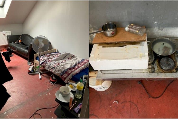 Østarbejderne var indkvarteret ulovligt i møgbeskidte lokaler med cigaretskodder på gulvet, gammelt stegefedt på komfuret og malerbøtter, der blev brugt som bordben. | Foto: Privat