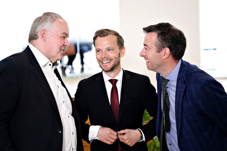 Beskæftigelsesminister Peter Hummelgaard (S) i en glad stund sammen med Dansk Folkepartis og Venstres beskæftigelsesordførere, Bent Bøgsted og Hans Andersen. | Foto: Philip Davali/Ritzau Scanpix