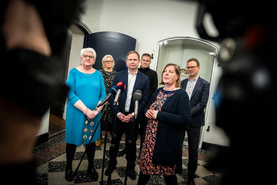 Doorstep foran Finansministeriet søndag eftermiddag, hvor parterne kunne præsenterer resultatet af de statslige overenskomstforhandlinger. | Foto: Emil Nicolai Helms/Ritzau Scanpix