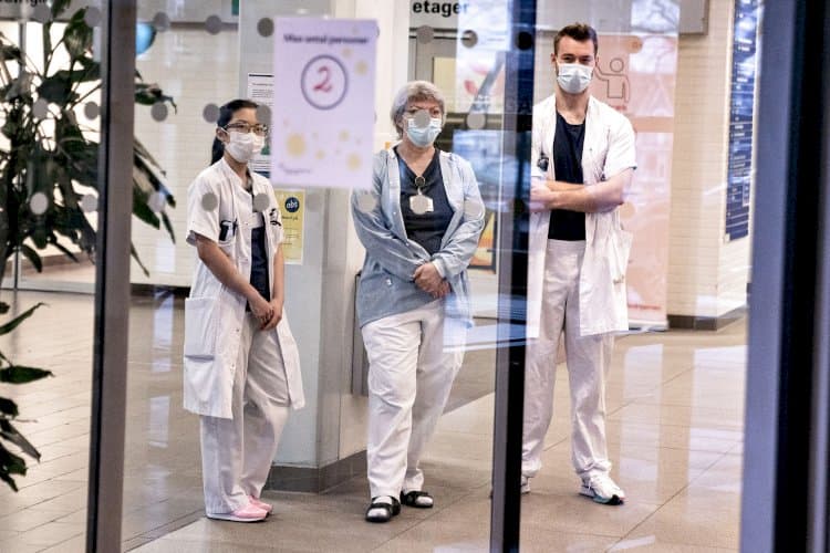 Sygeplejerske Elna Vinther Sørensen og tv. læge Sara Boelt Søgaard Larsen og th. medicinstuderende Theis Mariager er første frontpersonaler på Aalborg Universitetshospital, der får vaccination mod covid-19 i Region Nordjylland, søndag 27. december 2020. | Foto: Henning Bagger/Ritzau Scanpix