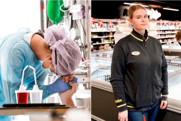 Sygeplejersker og unge i detailbranchen, har oplevet et hårdere arbejdsmiljø under coronakrisen. Til venstre ses ung butikchef fra Netto. | Foto: Olafur Steinar Gestsson/Linda Kastrup/Ritzau Scanpix