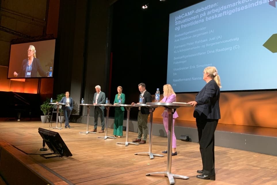 Beskæftigelsesminister Ane Halsboe-Jørgensen (S) deltog i en debat på Jobcamp med Erik Simonsen (DA), Nanna Højlund (FH), Peter Rahbæk Juel (KL) og Dina Raabjerg fra Det Konservative Folkeparti. | Foto: Jonas Sivkær Grønvall/A4