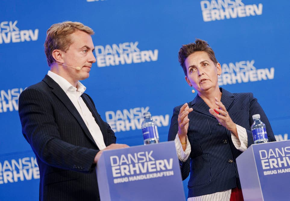Morten Messerschmidt og Pia Olsen Dyhr vil redde udvidelsen af seniorpensionen. Her deltager de i et arrangement hos Dansk Erhverv. | Foto: Liselotte Sabroe/Ritzau Scanpix