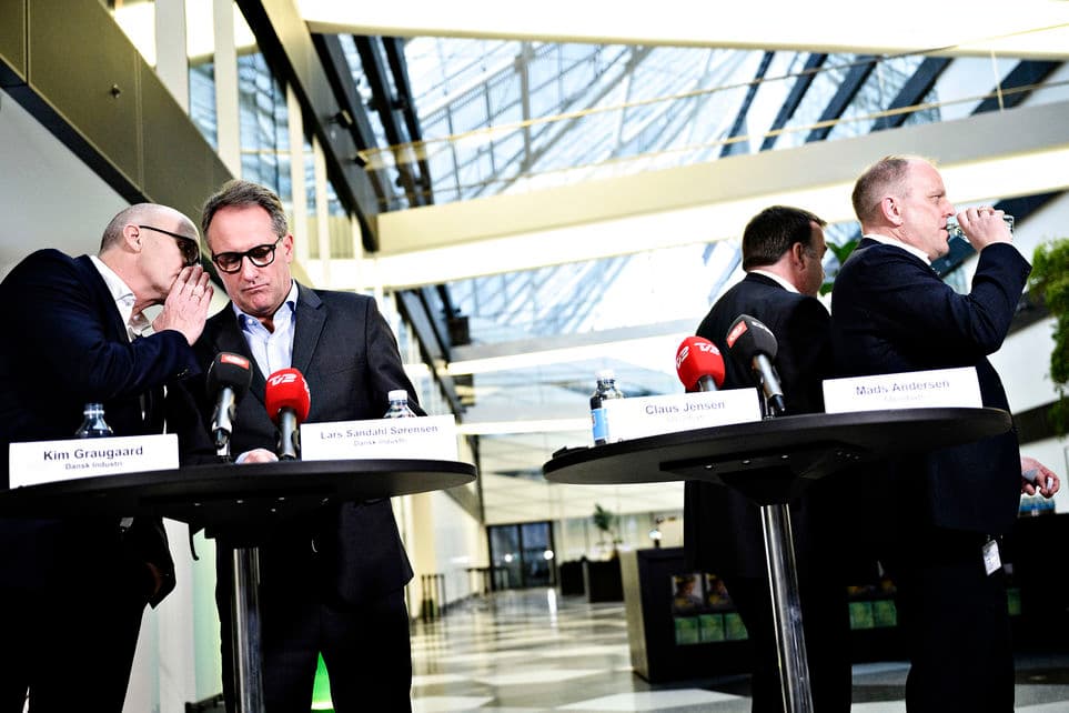 Topforhandlerne fra Dansk Industri viceadministrerende direktør Kim Graugaard og administrerende direktør Lars Sandahl (tv.) og topforhandlerne fra CO-Industri Claus Jensen, formand for Metal, og Mads Andersen, formand for 3F's industrigruppe (th.). | Foto: Philip Davali/Ritzau Scanpix
