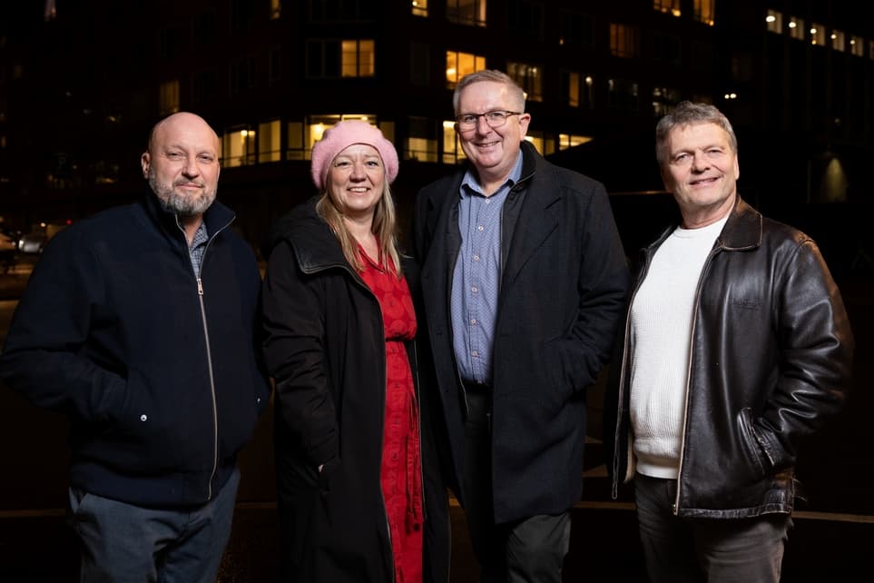 Fra Venstre: Blik- og Rør-formand Henrik W. Petersen, formand for Dansk Journalistforbund Tine Johansen, Dansk El-forbunds formand Benny Yssing og Malerforbundets formand Tonny Olsen. | Foto: Jonas Krøner