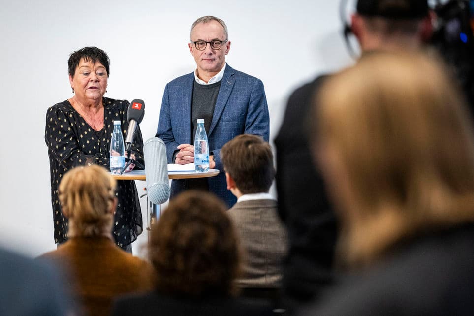 Forhandlingsfællesskabets formand, Mona Striib (tv.), og kommunal topforhandler Michael Ziegler (th.) på pressemødet fredag. | Foto: Martin Sylvest/Ritzau Scanpix
