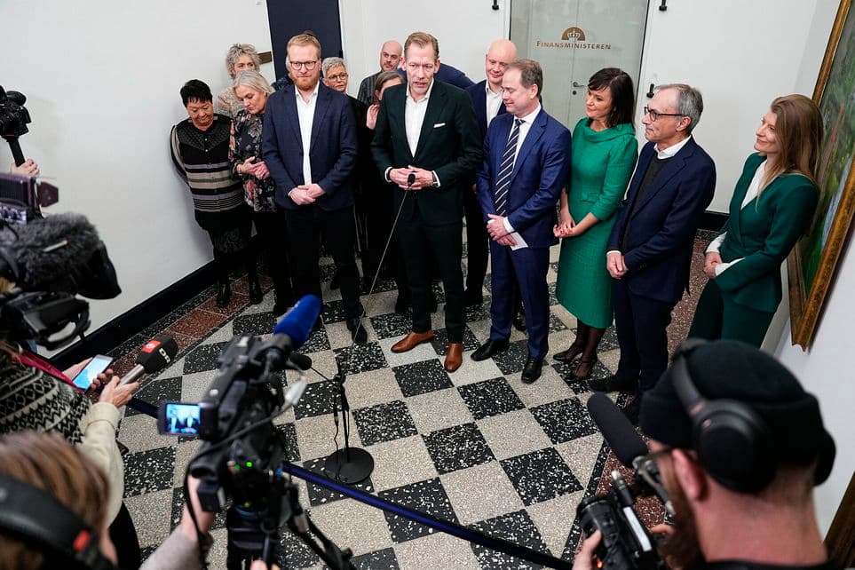 Parterne præsenterer aftalen om et ekstraordinært lønløft foran Finansministeriet. | Foto: Mads Claus Rasmussen/Ritzau Scanpix