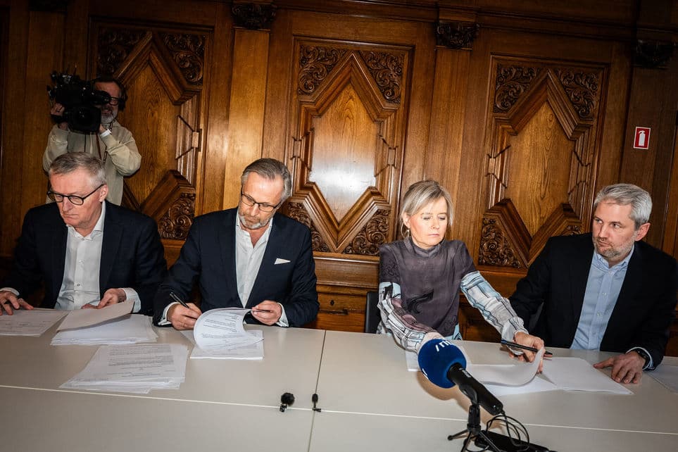 Der underskrives knap 50 aftaleprotokollater, der udgør det nye forlig på butiksområdet. Fra venstre Dansk Erhvervs viceadm. direktør Laurits Rønn, Dagrofas adm. direktør Tomas Pietrangeli, HK/Handel-formand Mette Høgh og underdirektør i Dansk Erhverv Jesper Østergaard Bocianski. | Foto: Emil Nicolai Helms/Ritzau Scanpix