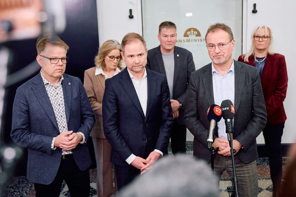 Formand for AC Tomas Kepler, finansminister Nicolai Wammen (S), CFU-Formand Gordon Ørskov Madsen og gruppeformand for Den Offentlige Gruppe i 3F Lydia Frydendal Granzow Callesen til præsentation af overenskomstforliget på det statslige område i Finansministeriet onsdag den 11. februar 2026. | Foto: Thomas Traasdahl/Ritzau Scanpix