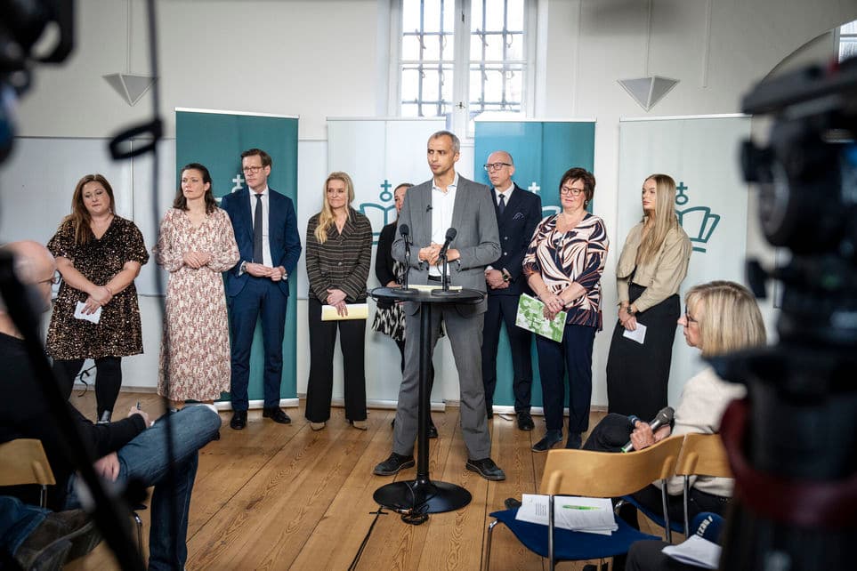 Børne- og undervisningsminister Mattias Tesfaye (S), Lotte Rod (RV), Anni Matthiesen (V), Alex Ahrendtsen (DF), Lars Arne Christensen (M), Lise Bertelsen (KF), Astrid Krag (S), Sara Emil Baaring (S) og Helena Artmann Andresen (LA). | Foto: Mads Claus Rasmussen/Ritzau Scanpix