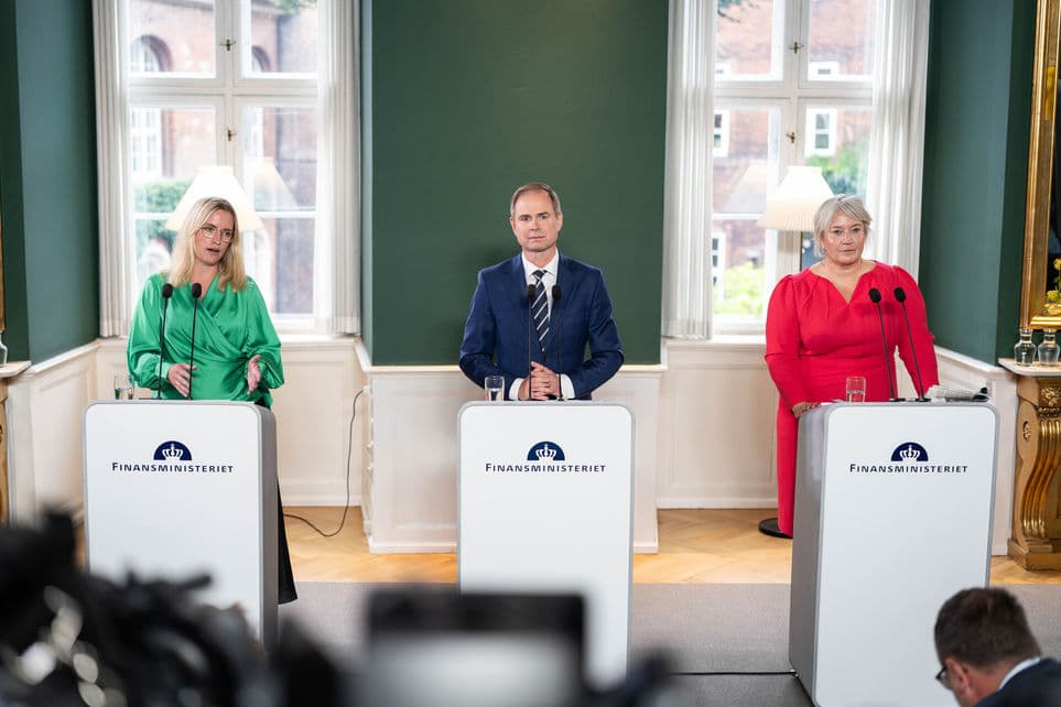Finansminister Nicolai Wammen (S), økonomiminister Stephanie Lose (V) og uddannelses- og forskningsminister Christina Egelund (M) præsenterer regeringens finanslovforslag for 2025. | Foto: Emil Nicolai Helms/Ritzau Scanpix
