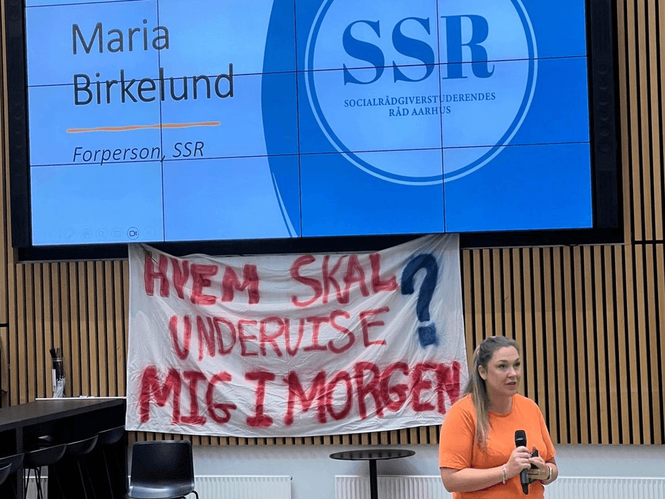 Maria Birkelund var blandt initiativtagerne til en demonstration på VIA i Aarhus. Formålet var at råbe politikerne op om socialrådgiveruddannelsens lave taxameter. | Foto: Privatfoto